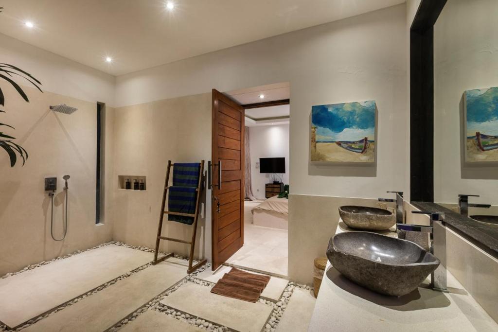 You will enter the villa by the living room which opens onto the tropical garden and the pool. On your left is the long bar of the fully equipped kitchen.