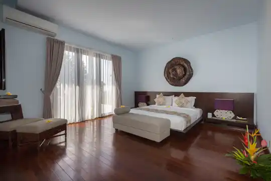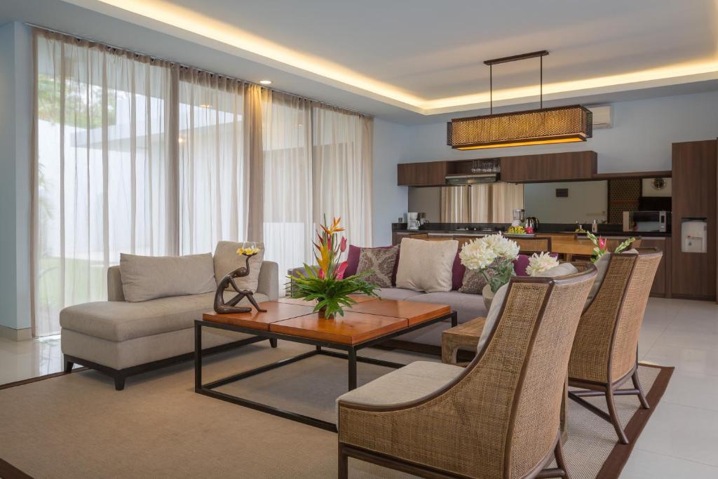 Tastefully decorated, the villa features a fully equipped kitchen, dining area and a living room fitted with floor-to-ceiling windows overlooking the pool and garden. A flat-screen cable TV and plush cushions are included in the living area, while each air-conditioned room provides a dressing room, personal safe and a private bathroom.